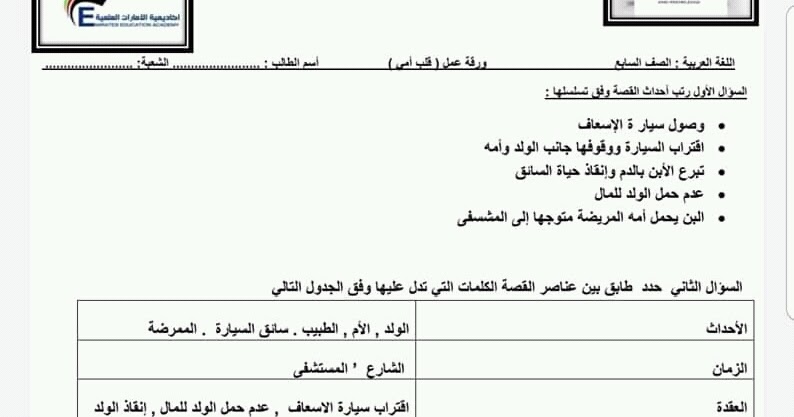 ورقة عمل قلب امي في اللغة العربية للصف السابع الفصل الثاني