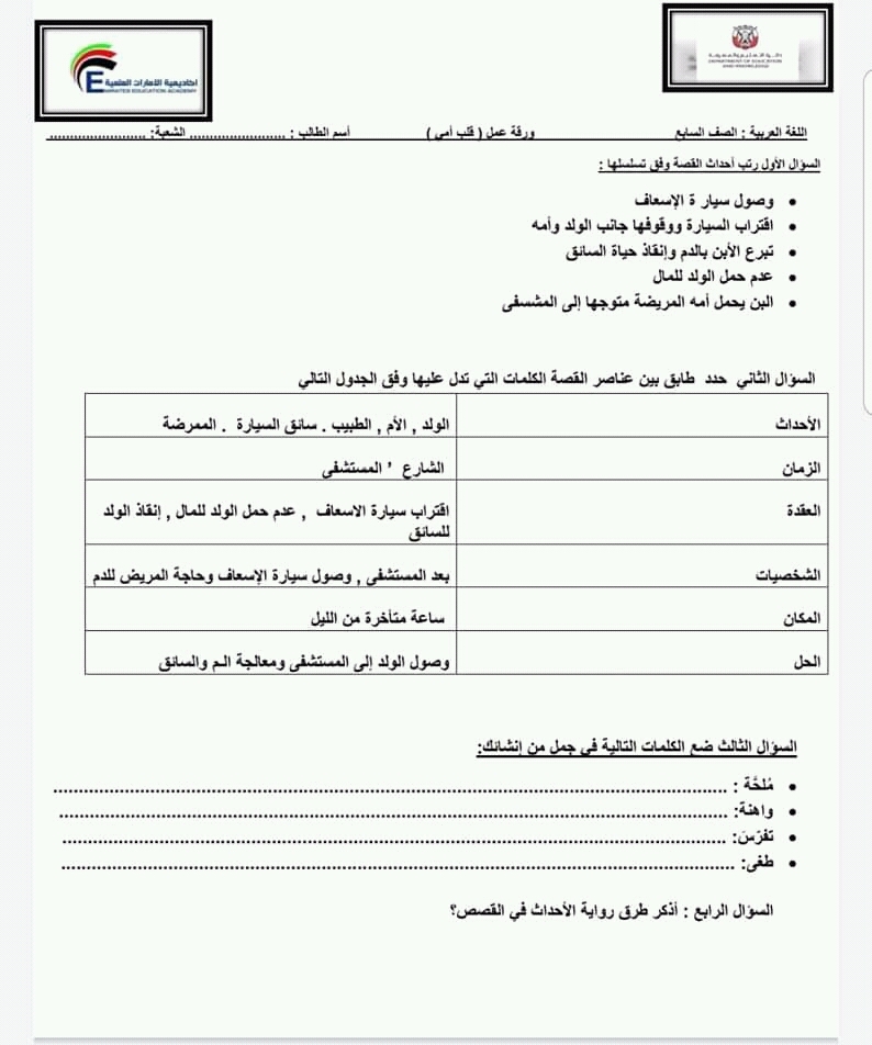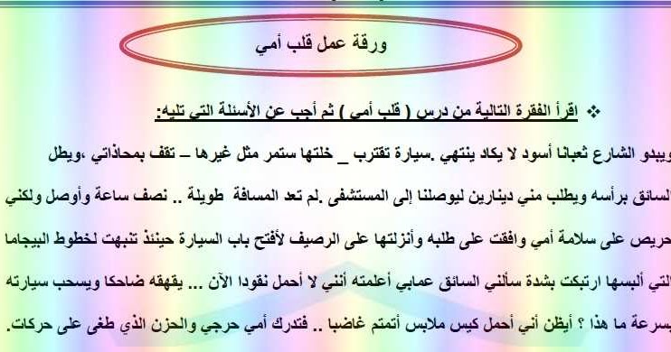 ورقة عمل قلب امي في اللغة العربية للصف السابع الفصل الثاني
